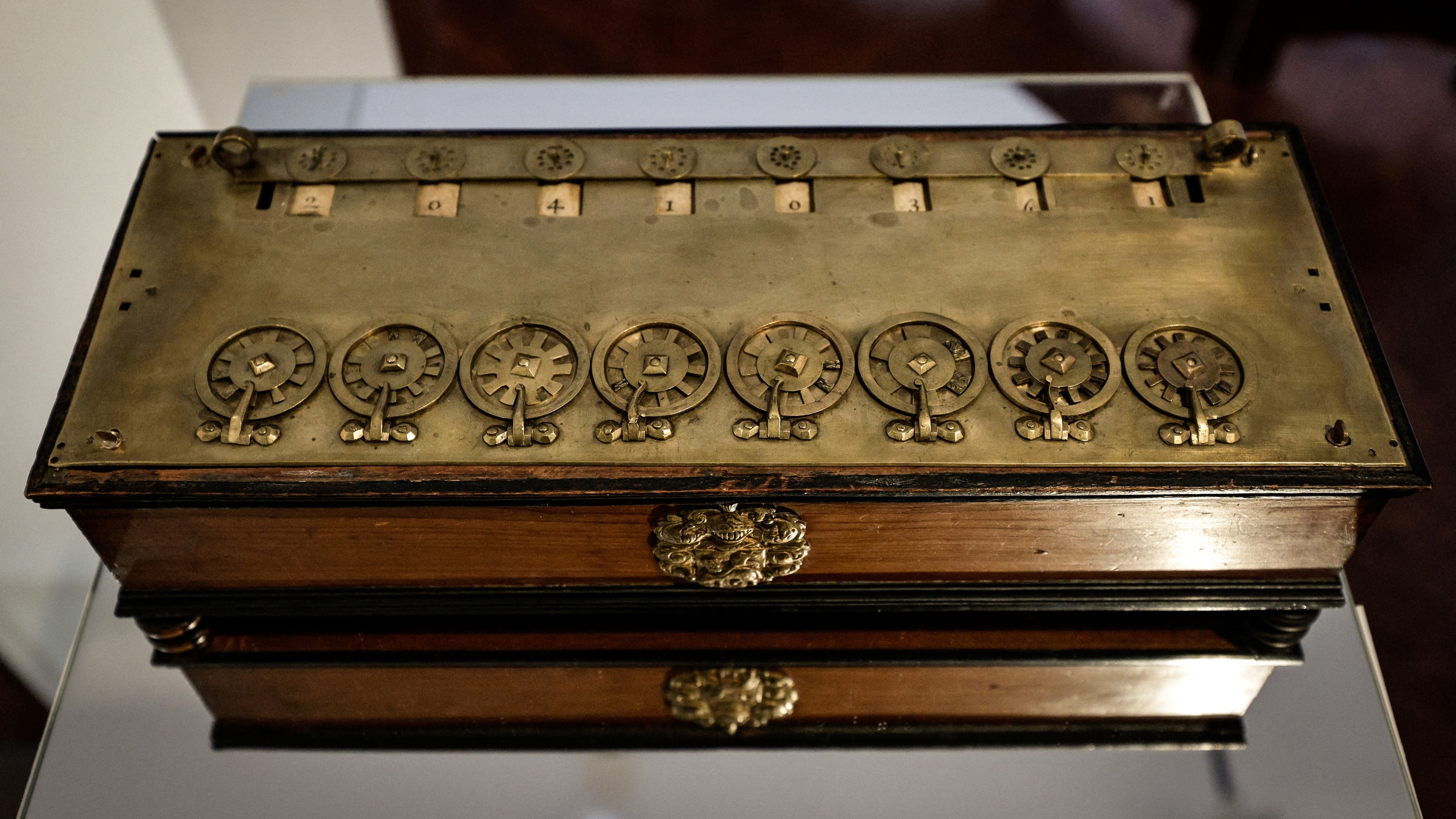 La Pascaline, première machine à calculer mécanique inventée par le mathématicien français Blaise Pascal, exposée à la maison de ventes Christie’s à Paris, le 11 septembre 2025.
