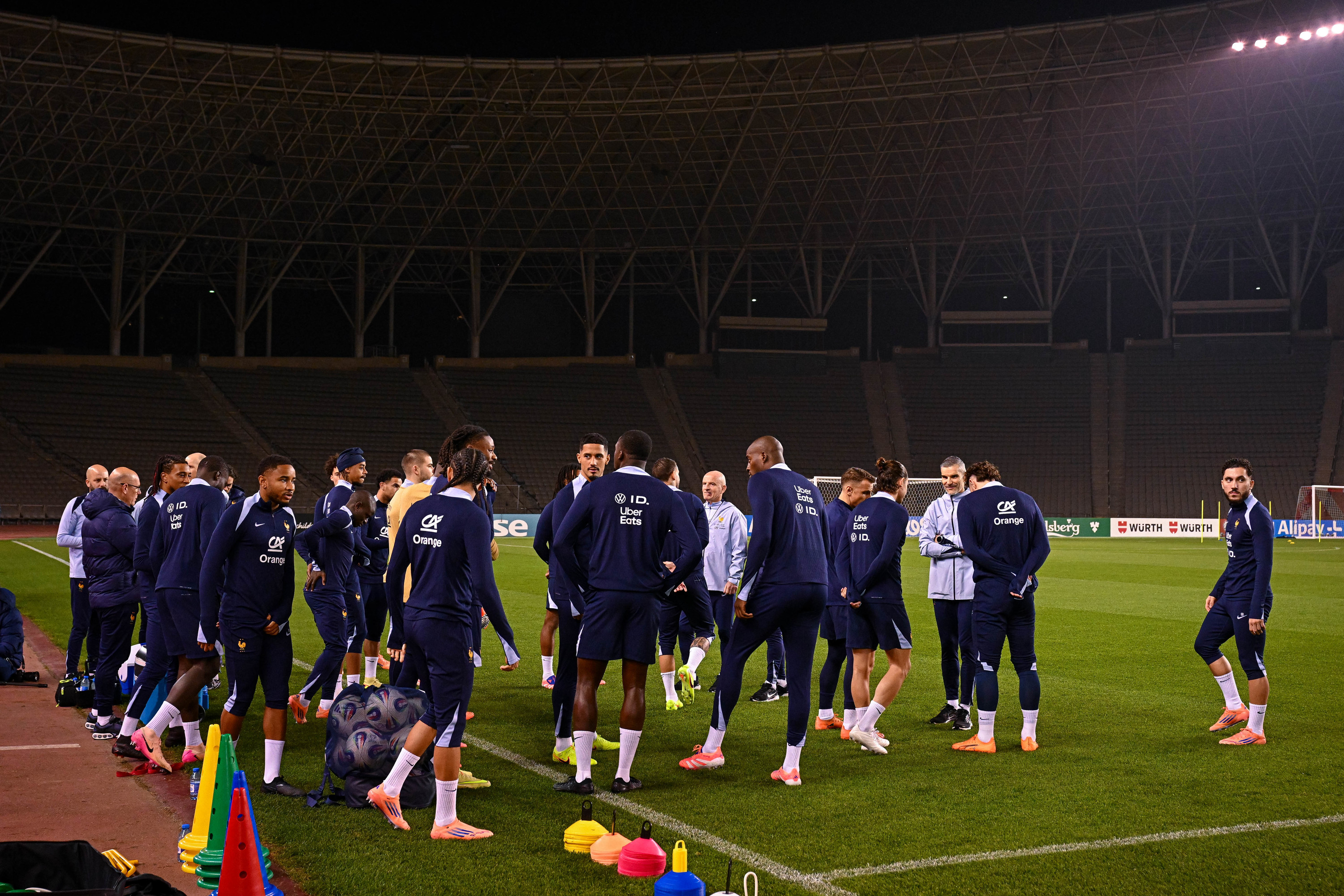 Les membres de l’équipe nationale palestinienne de football portent le traditionnel béret basque, à leur arrivée à l’aéroport de Bilbao, le 11 novembre 2025.