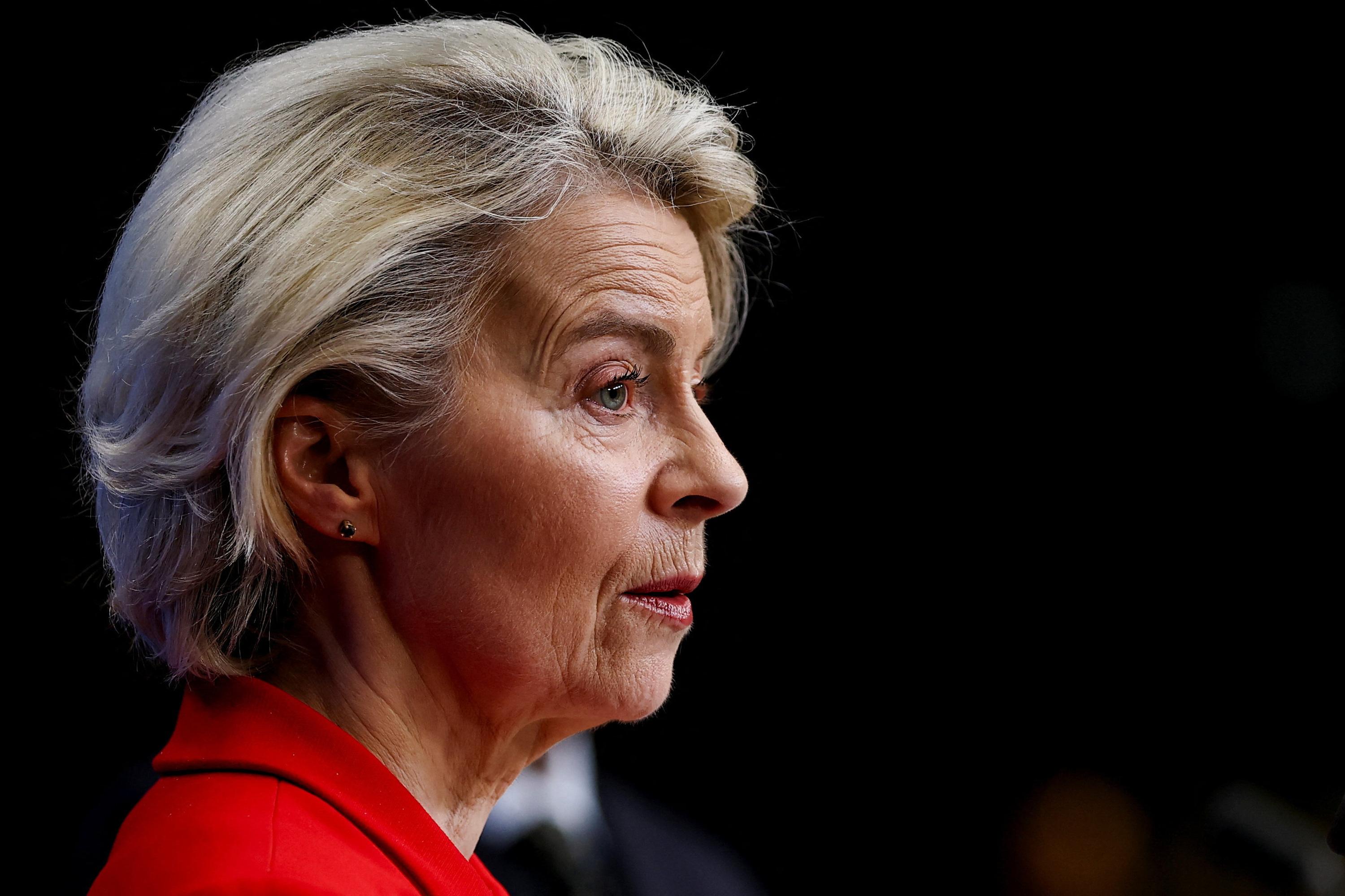 La présidente de la Commission européenne, Ursula von der Leyen, et le président du Conseil européen, Antonio Costa, après la réunion d’urgence des Vingt-Sept, dans la nuit du jeudi 22 au vendredi 23 janvier, à Bruxelles.