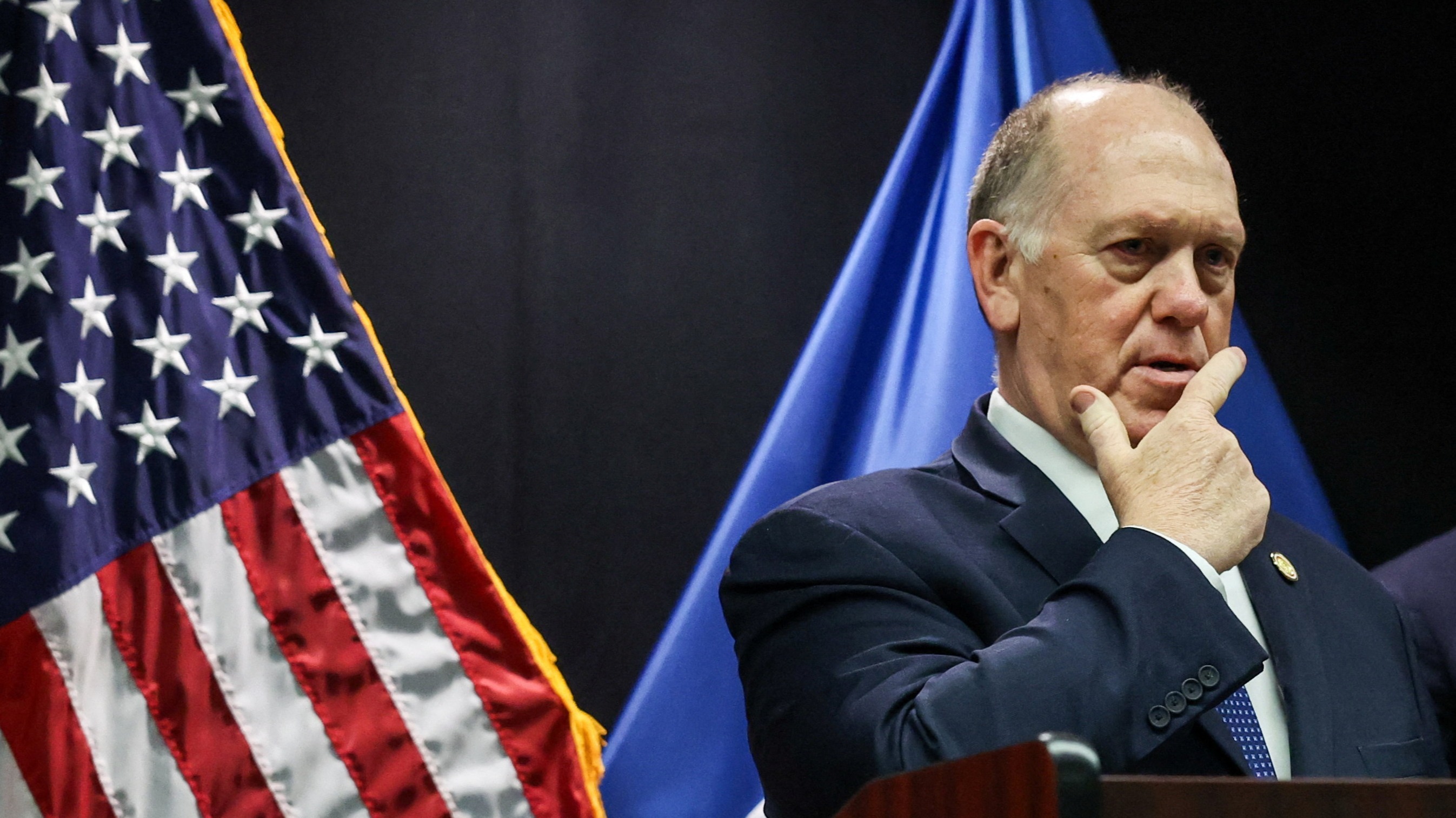 Le tsar des frontières de la Maison-Blanche, Tom Homan, fait un geste lors d’une conférence de presse, à Minneapolis, Minnesota, États-Unis, le 29 janvier 2026.