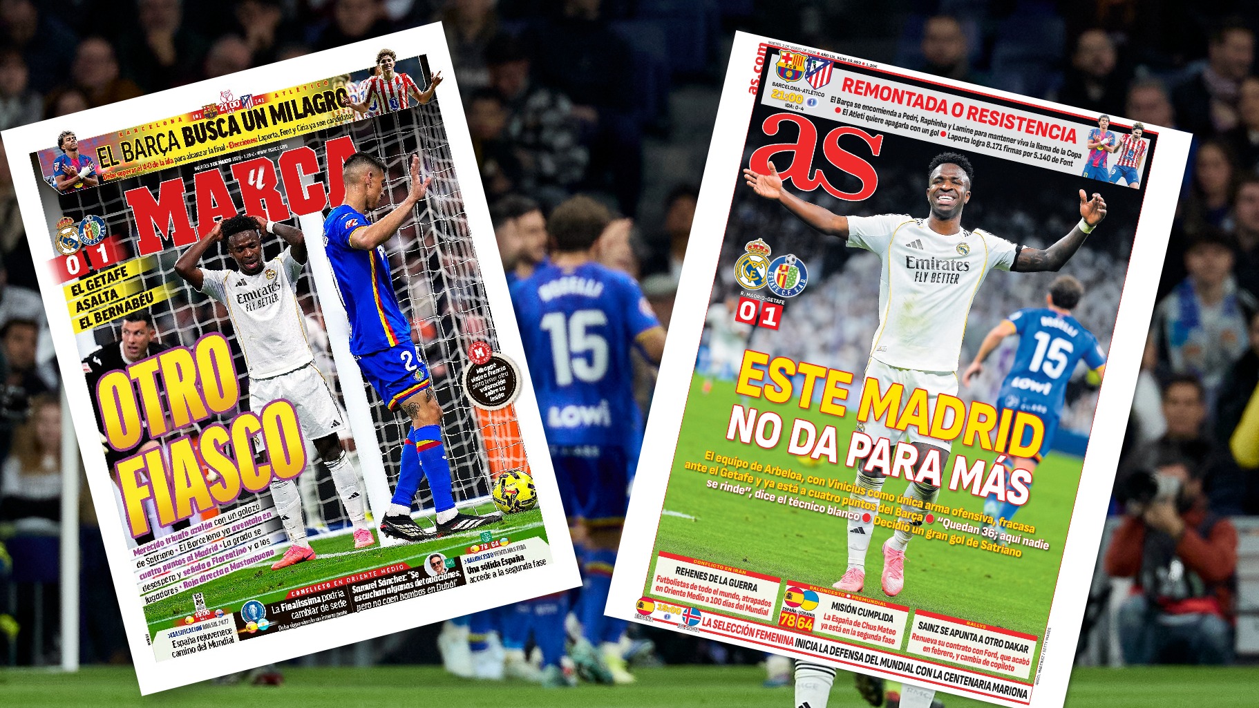 REVUE DE PRESSE - Au lendemain de la défaite des Merengue contre Getafe en Liga, qui laisse les hommes d’Alvaro Arbeloa à 4 points du FC Barcelone, les médias espagnols ne se font plus d’illusion sur les capacités des Madrilènes à remporter le titre.