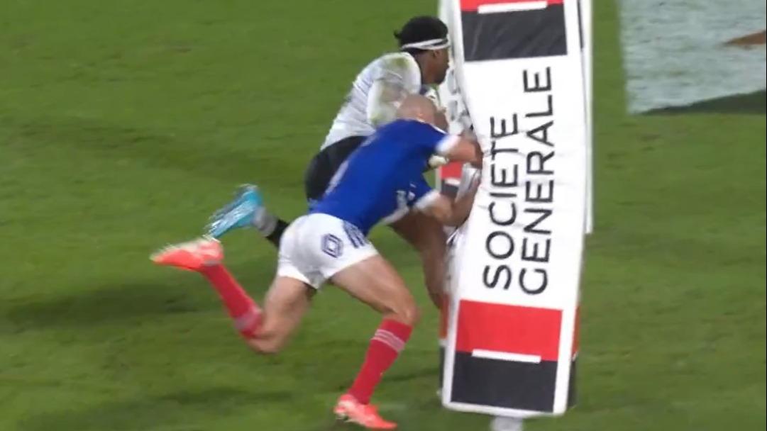 Le demi de mêlée de Bordeaux-Bègles est revenu sur cette action cocasse où il finit sur la protection en mousse des poteaux en voulant défendre sur l’ailier fidjien Ravouvou.