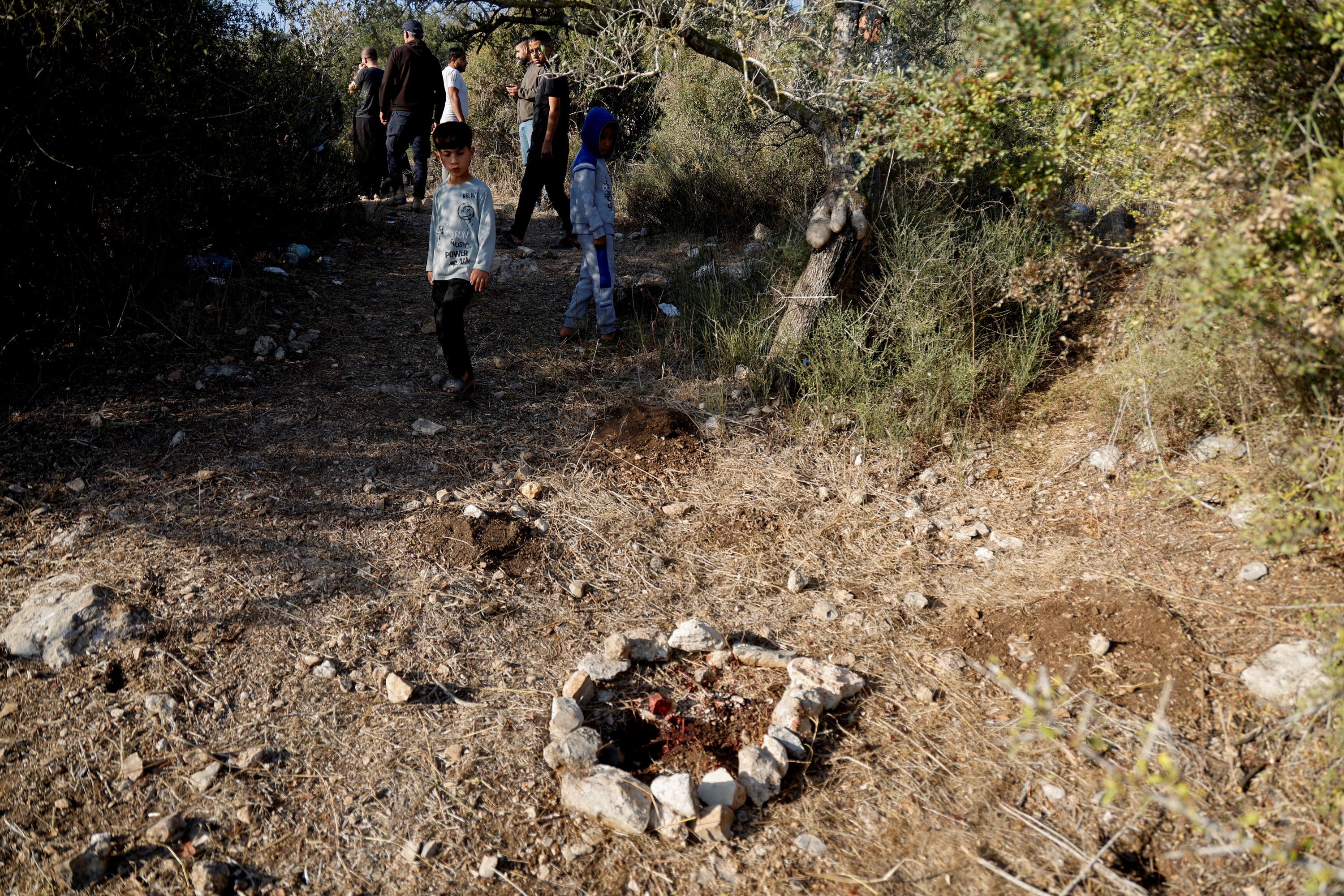 Des personnes inspectent les lieux où les forces israéliennes ont tué trois Palestiniens, près de Jénine en Cisjordanie occupée par Israël, le 28 octobre 2025.