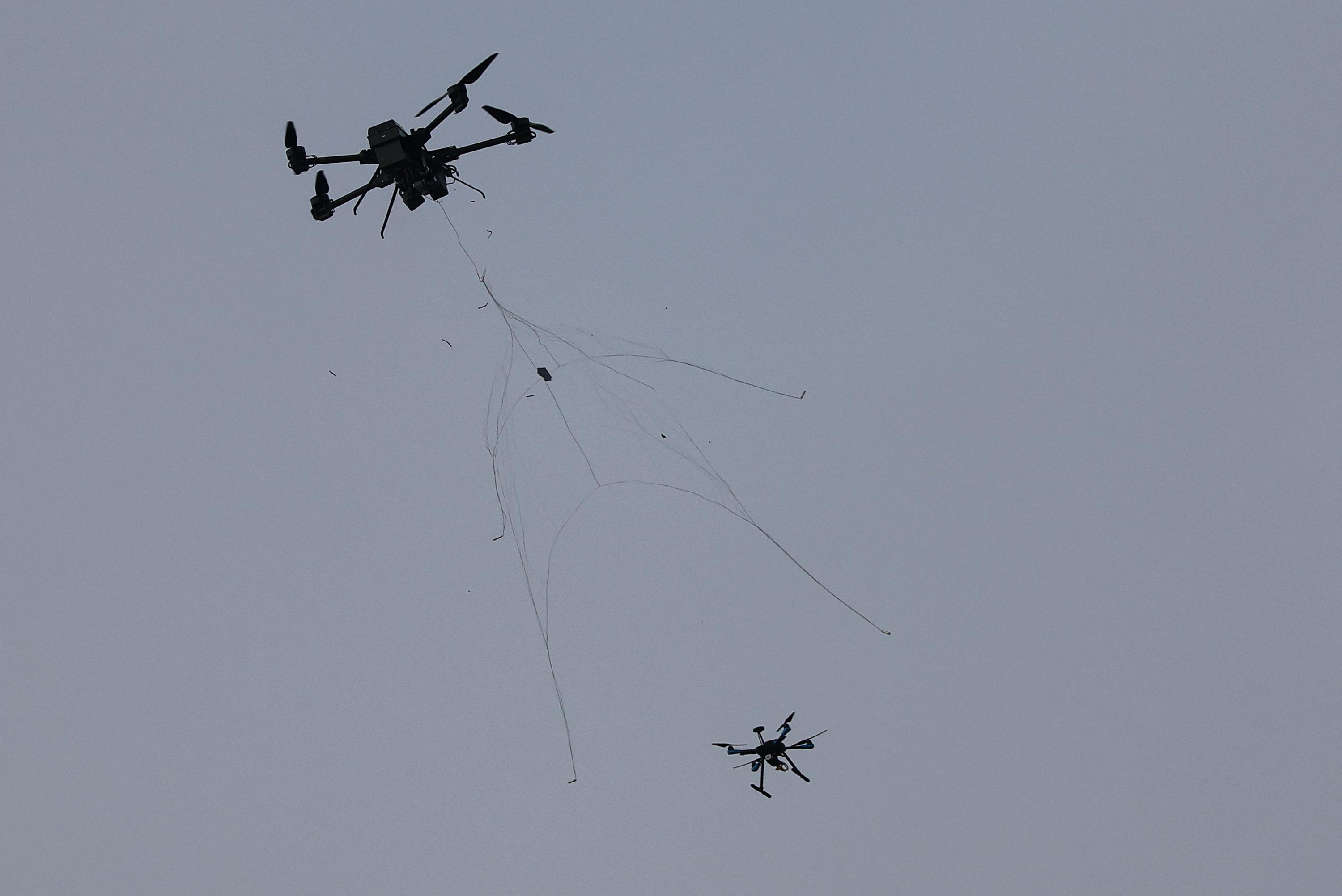 Un drone appartenant à la nouvelle unité de défense de la police fédérale allemande utilise un filet pour capturer un autre drone, lors d’une démonstration ce mardi à Ahrensfelde.