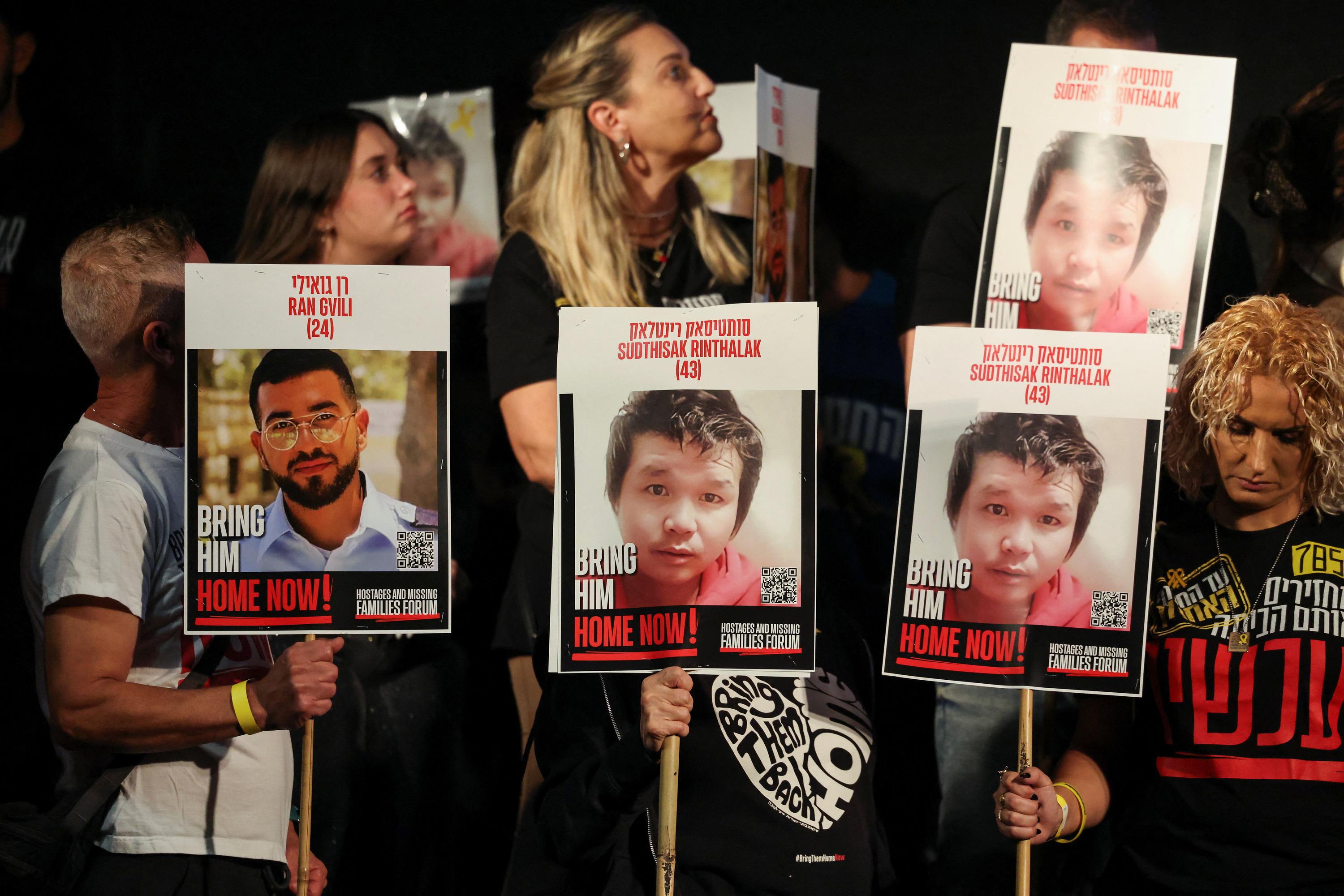 Des personnes tiennent des photos des otages dont les corps n’ont pas encore été rendus, sur la place des otages à Tel Aviv, Israël, le 29 novembre 2025.