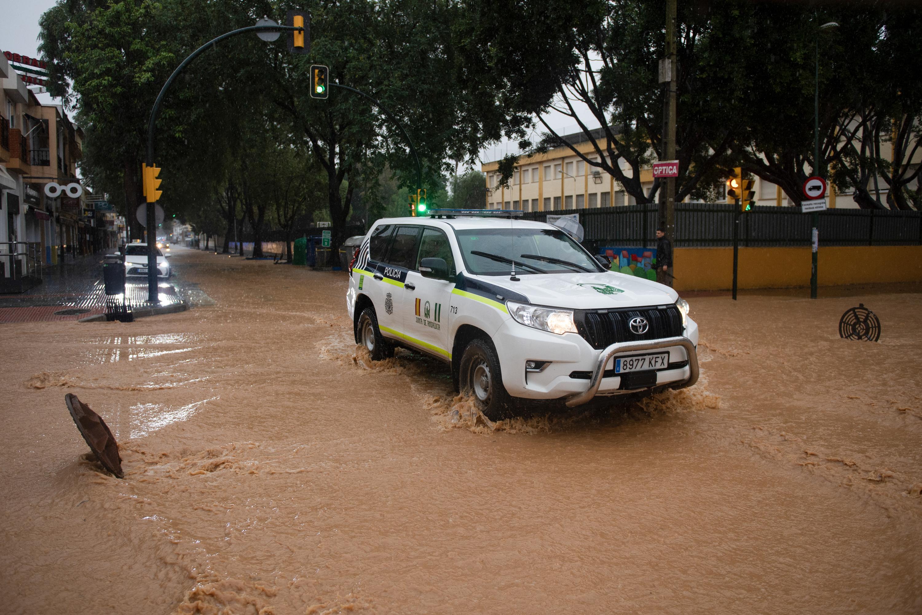 Une voiture de police patrouille dans une rue inondée à Campanillas, près de Malaga, dans le sud de l’Espagne, le 13 novembre 2024 (photo d’archives).