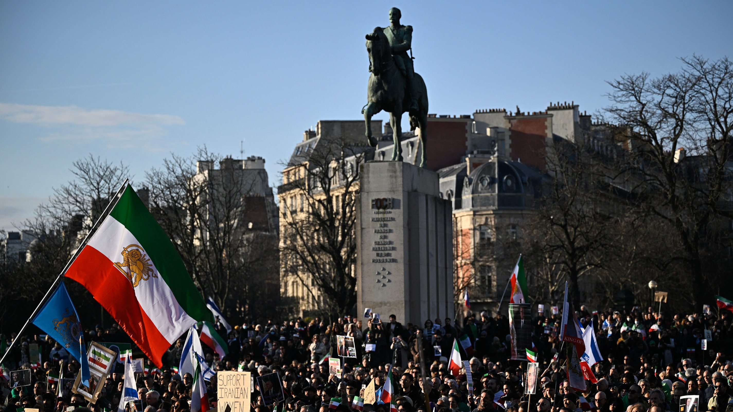 Beaucoup de manifestants arboraient des portraits de Reza Pahlavi, le fils du chah qui, depuis son exil aux États-Unis, se pose en figure de la contestation.