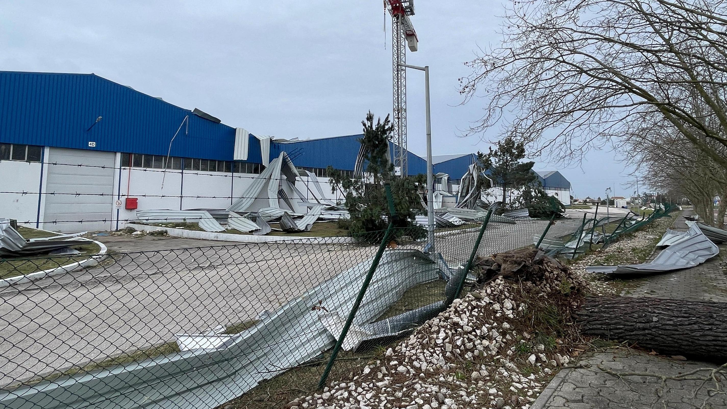 Une photo prise le 28 janvier 2026 montre des débris arrachés à un bâtiment industriel à Marinha Grande, après le passage de la tempête Kristin au Portugal.