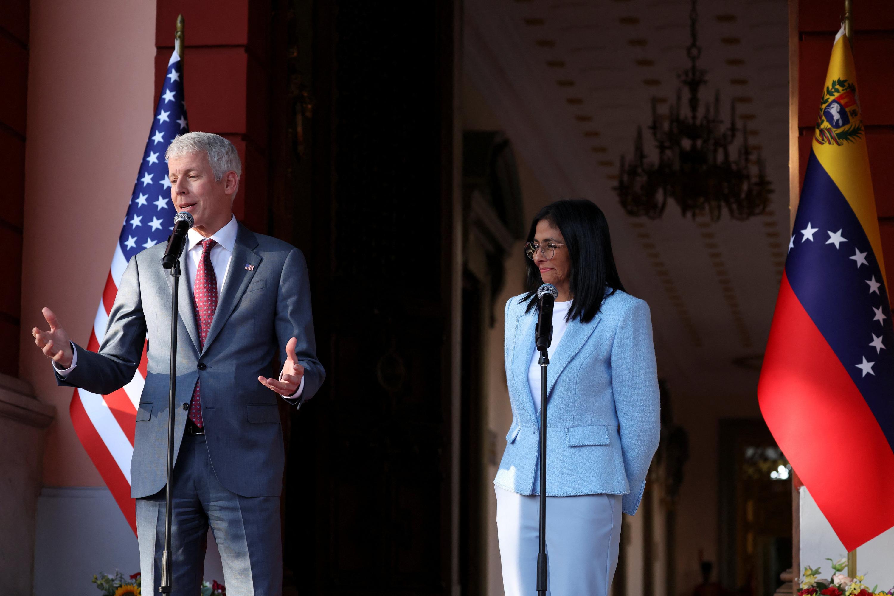 Le secrétaire américain à l’Énergie, Chris Wright, et la présidente par intérim du Venezuela, Delcy Rodriguez, à l’issue d’une réunion à Caracas, le 11 février 2026.
