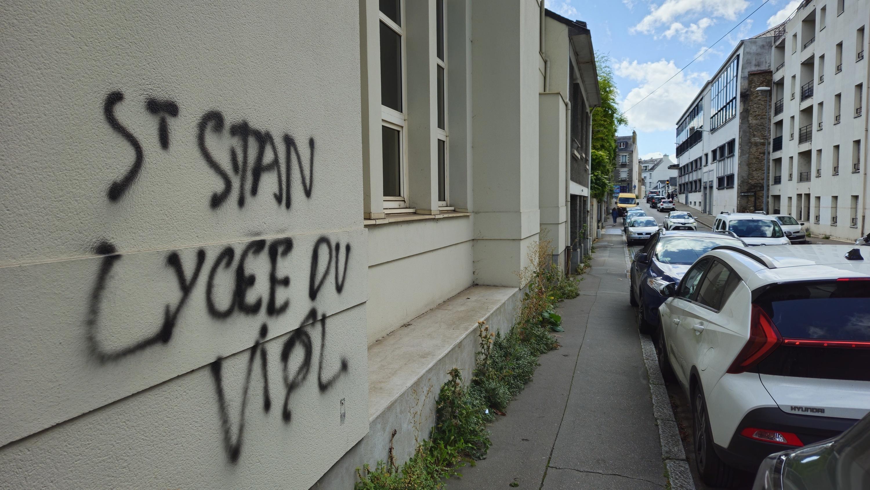 Un tag, réalisé fin août 2025, dénonçant les agressions sexuelles commises au sein de l’établissement privé d’enseignement catholique Saint-Stanislas, à Nantes (Loire-Atlantique).