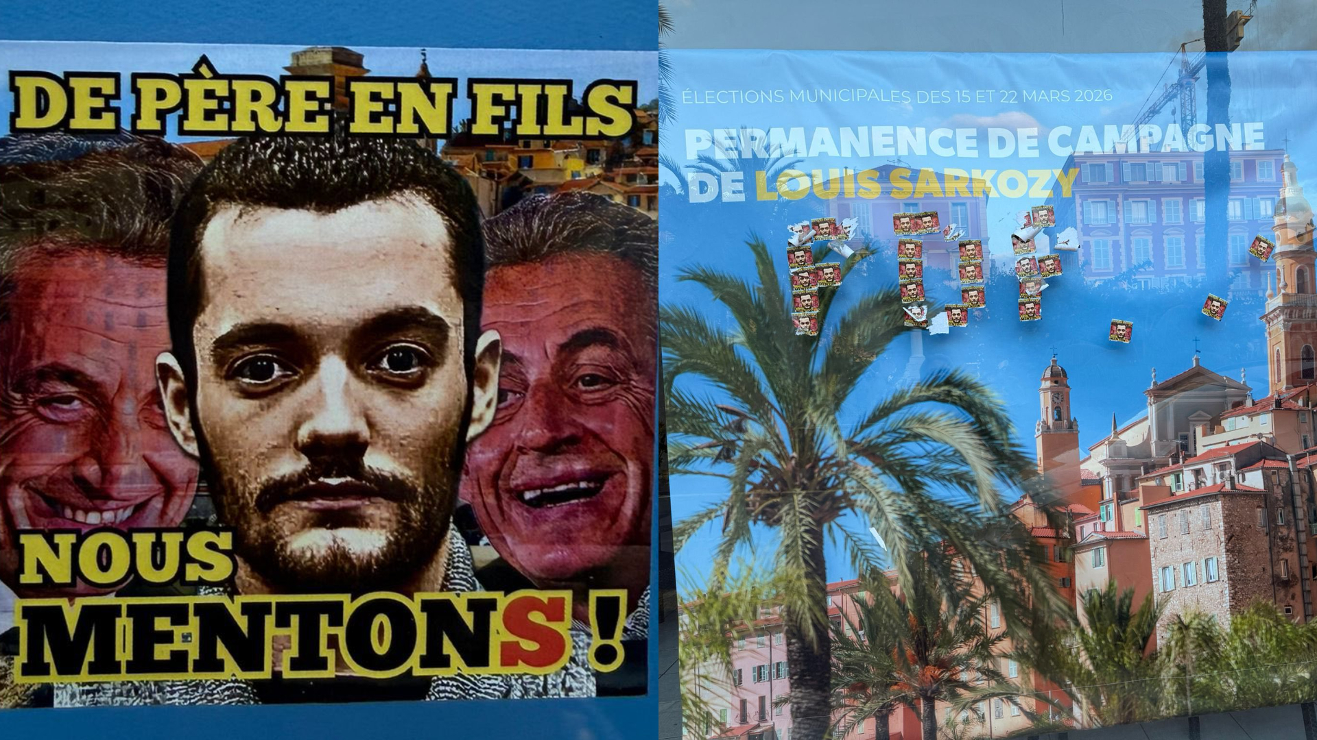 Pour la deuxième fois en deux semaines, plusieurs affiches ont été placardées sur la devanture de la permanence de Louis Sarkozy à l’hôtel de ville mentonnais, qui dénonce des «méthodes indignes».
