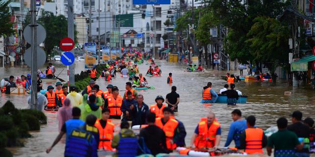 Cette photo prise le 20 novembre 2025 montre des personnes pataugeant dans les eaux de crue à Nha Trang, dans la province côtière de Khanh Hoa, au Vietnam.