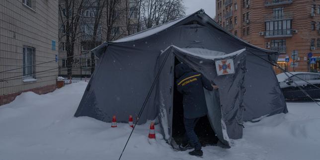 Un secouriste ukrainien ouvre un abri pour permettre aux habitants de recharger leurs appareils et de se réchauffer, à Kiev, le 9 janvier 2026.