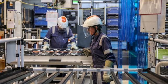 Sur la chaîne de production de la voiture électrique Peugeot e-3008, à l’usine Stellantis de Sochaux (Doubs), le 12 septembre 2023.