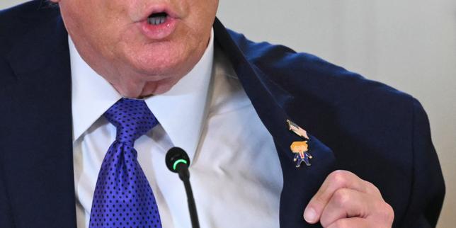 Le président américain, Donald Trump, montre un pin’s le représentant lors d’une réunion avec des dirigeants de compagnies pétrolières américaines, à Washington, le 9 janvier 2026.