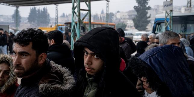 Un jeune garçon déplacé, dans l’attente des bus affrétés par le gouvernement, à la gare routière d’Afrin (Syrie), pour retourner dans le quartier d’Achrafieh à Alep, le 12 janvier 2026.
