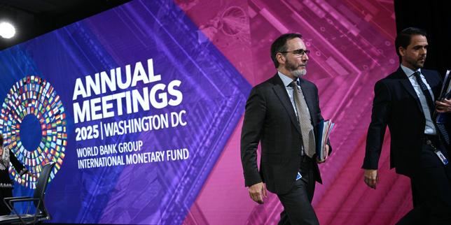 De gauche à droite, Pierre-Olivier Gourinchas, économiste en chef du Fonds monétaire international (FMI) et José Luis De Haro, chef du service de communication du FMI, à Washington, le 14 octobre 2025.