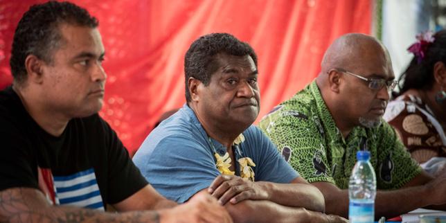 Le leader indépendantiste kanak Christian Tein (au centre) lors du congrès du Front de libération nationale kanak socialiste (FLNKS), à Ponerihouen, en Nouvelle-Calédonie, le 6 décembre 2025.