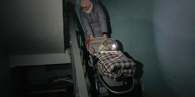 Une femme monte les escaliers avec sa poussette dans un immeuble de Kiev, lors d’une panne de courant provoquée par les frappes aériennes répétées de la Russie sur le réseau électrique du pays, le 2 février 2026.